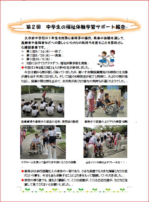 久寺家中学校の1年生を対象に車椅子の操作、乗車の体験を通して、高齢者や身障者などへの優しいいたわりの気持ちを育むことを目的とした継続事業です。